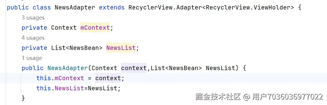 - 初始化适配器:创建 NewsAdapter 实例,将当前 Activity 的上下文(this)和初始化好的 NewsList 数据源传递给 Adapter,完成 Adapter 的初始化。