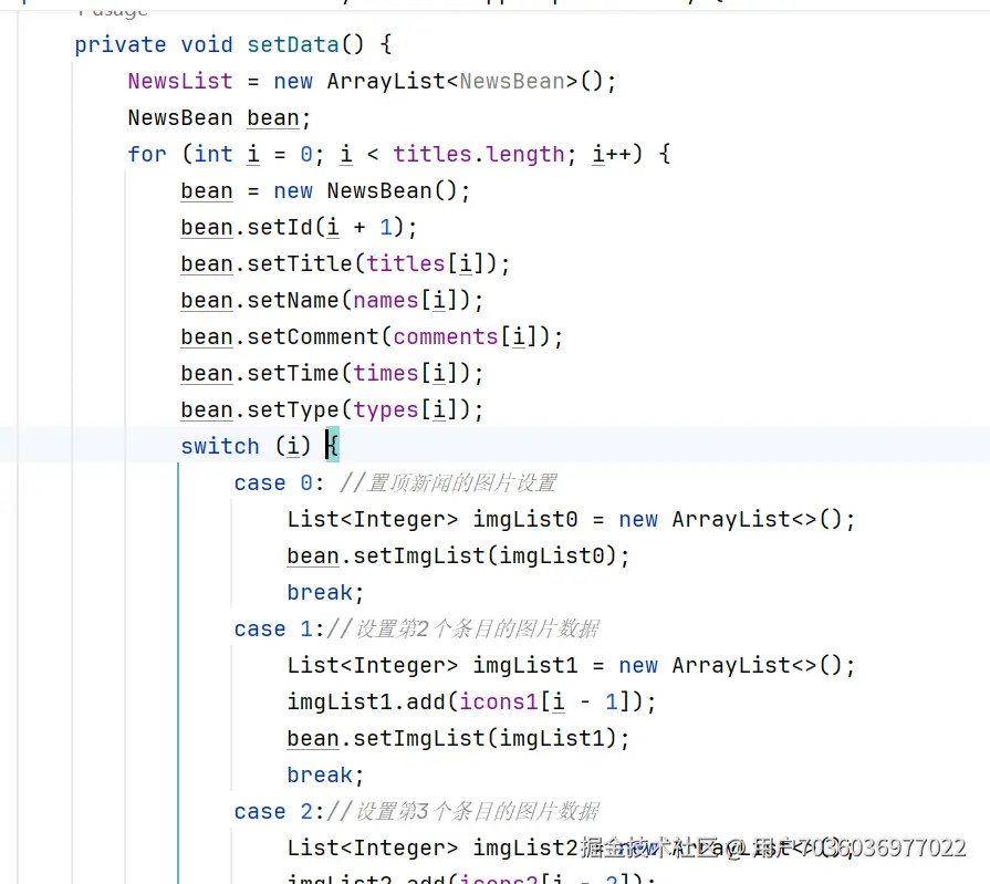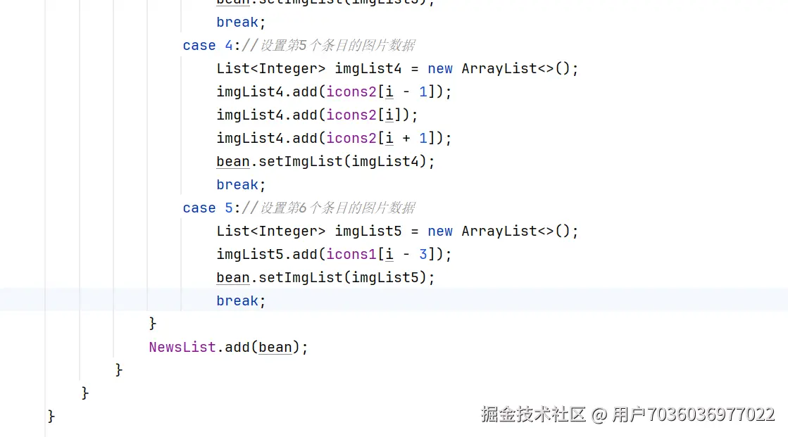 这里的 switch 语句(或 if-else 语句),主要用于根据新闻类型,为不同布局的新闻分配对应的图片资源,确保图片与布局类型匹配——就像手工包装车间里,工人根据盒子的类型(单图/三图),挑选对应的图片塞进去,最后打包成完整的“产品(NewsBean 对象)”。