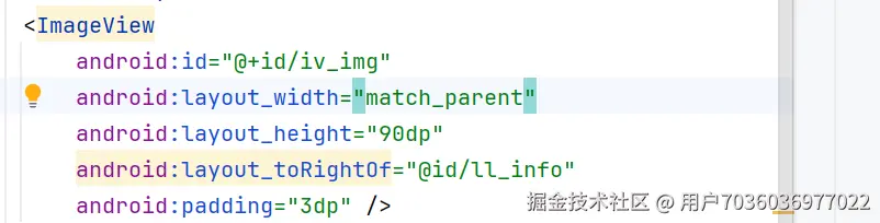 右侧信息区域位于布局右侧,紧邻左侧信息区的右边。其中,一张图片占据了整个右侧区域,借助代码 android:layout_toRightOf="@id/ll_info" 明确指定了其位置在左侧 ll_info 的右侧。