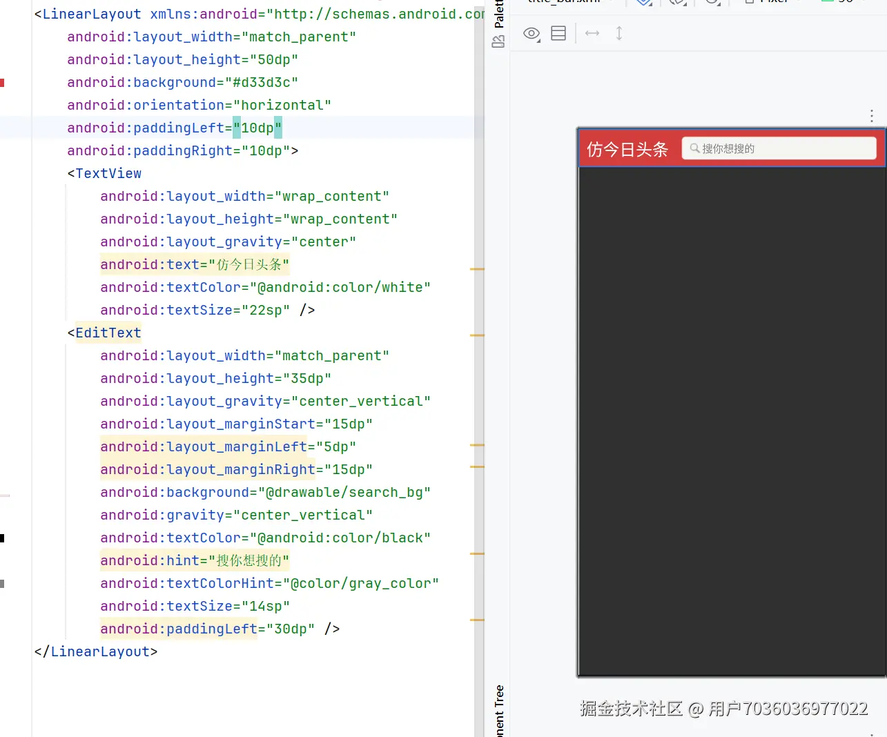 ② 标题栏布局:在title_bar.xml中,水平排布标题文字“仿今日头条”与搜索输入框EditText,其中标题文字设置layout_gravity为居中,搜索框设置layout_weight为1,使其自适应填充标题栏剩余空间,实现“标题居中、搜索框靠右”的布局效果,贴合今日头条原生APP的标题栏样式;编辑