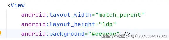 【配置说明】:通过XML属性设置View的尺寸和样式,具体为:layout_width设置为match_parent(匹配父容器宽度),layout_height设置为1dp(极细的线条),background设置为浅灰色,确保分隔线清晰可见但不突兀,与整体界面风格保持一致。