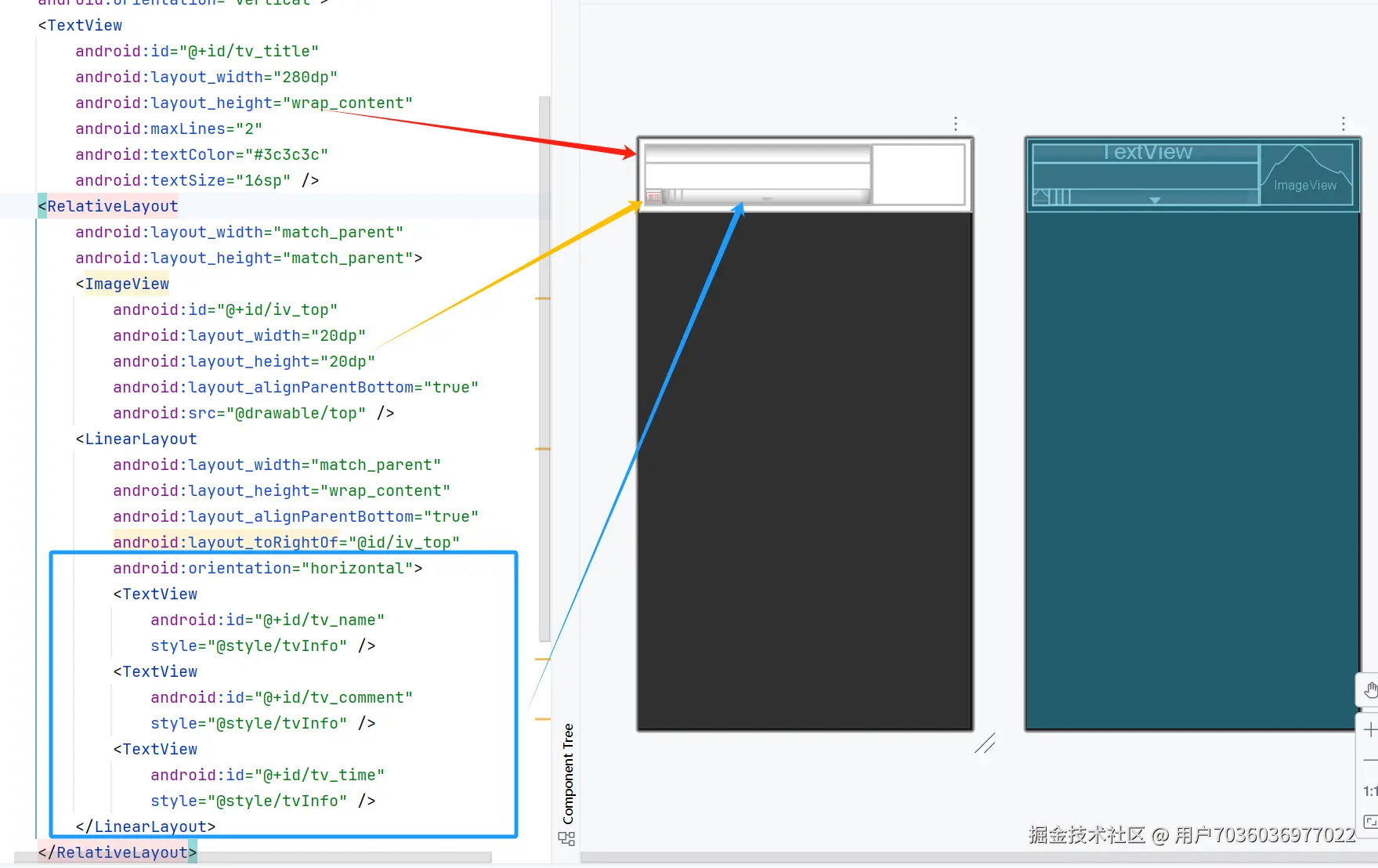 外层容器(垂直方向)📍 负责整体定位 :整个信息栏(包括名字、时间等)需要显示在图片列表(ll_img)的下方。因为父布局是 RelativeLayout,这个属性必须写在直接子 View 上才生效。如果没有这个外层容器,里面的文字就无法正确地“跑”到图片下面去。