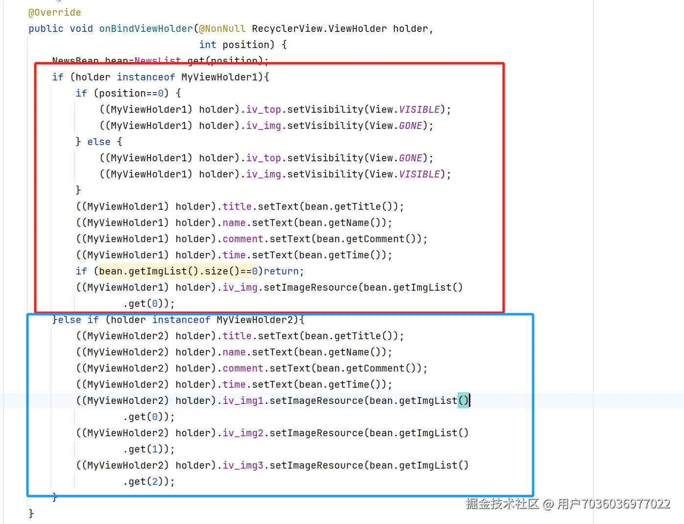 更重要的是,MyViewHolder1 支持特殊样式的缓存复用:布局中的置顶图标、图片控件的显隐状态,都会随 ViewHolder 一起被回收和复用,无需重复初始化。无论是置顶新闻、普通单图新闻,还是无图新闻,都可以复用同一个 MyViewHolder1 实例,仅修改控件状态即可,进一步降低内存开销,提升列表运行效率。