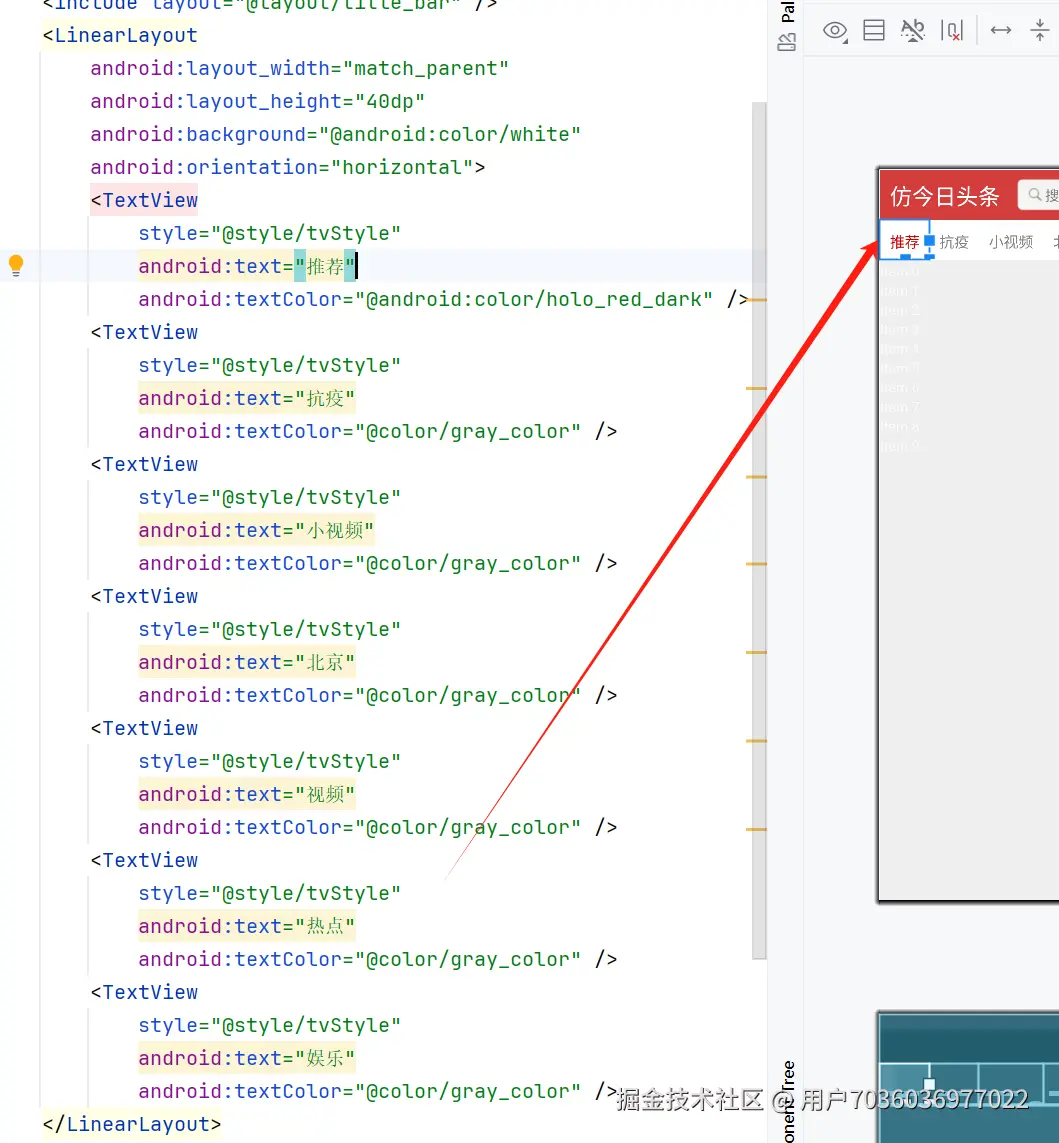 容器内部通过多个 TextView 控件分别承载不同的频道标签,包括推荐、抗疫、小视频、北京、视频、热点等,每个 TextView 都统一引用了 @style/tvStyle 样式,确保标签的字体大小、字重、内边距等基础样式保持一致,让整体视觉更协调统一,同时也简化了样式维护的代码量。视觉效果层面,“推荐” 标签采用了深色系的红色文字,在白色背景下格外醒目,对应预览图中红色高亮显示的选中状态,直观提示当前默认选中的频道,而其余标签如抗疫、小视频等则使用灰色文字,呈现未选中的常规状态,与预览图中灰色普通标签的展示效果精准匹配,这种色彩区分的设计清晰传递了频道选中与未选中的状态差异,帮助用户快速识别当前所在频道。布局逻辑层面,水平线性布局的默认排列方式让所有标签依次横向排布,无需额外设置复杂的布局参数,即可实现标签的横向流转展示,同时每个 TextView 控件都可通过设置点击事件,实现频道切换的交互功能,代码层面只需为每个标签绑定点击逻辑,即可完成对应频道内容的展示切换,开发实现成本低且交互逻辑清晰。