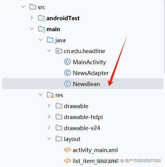 - 初始化数据源:创建 NewsList 集合(用于存储封装后的 NewsBean 对象),并调用 setData() 方法,将前面定义的静态数据封装成 NewsBean 对象,添加到 NewsList 中。