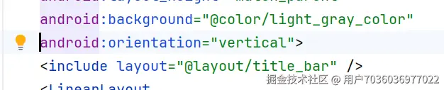 引用了@layout/title_bar,位于页面最顶端,显示 App 名称或搜索框。