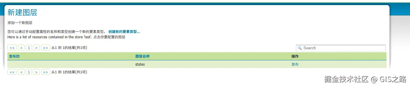因为图层存在于存储仓库的数据源中,所以需要新建存储仓库,然后添加对应的数据源。在新建图层页面的发布列表中中,有一操作列,点击发布按钮即可完成服务发布。