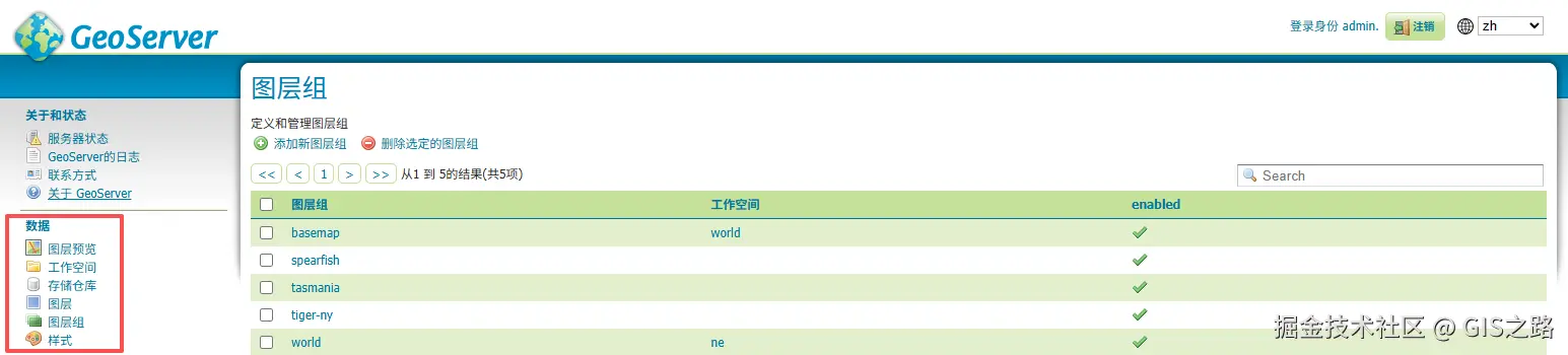 打开GeoServer,进入到项目管理界面,左侧的数据选项为最重要、最常用的部分。其中包括了图层预览、工作空间、存储仓库、图层、图层组和样式6大模块。