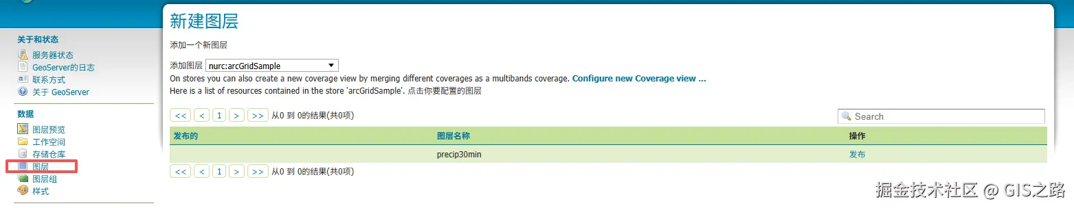 GeoServer想发布图层服务时很是摸不着头脑,不知道在哪里调出这个发布页面。