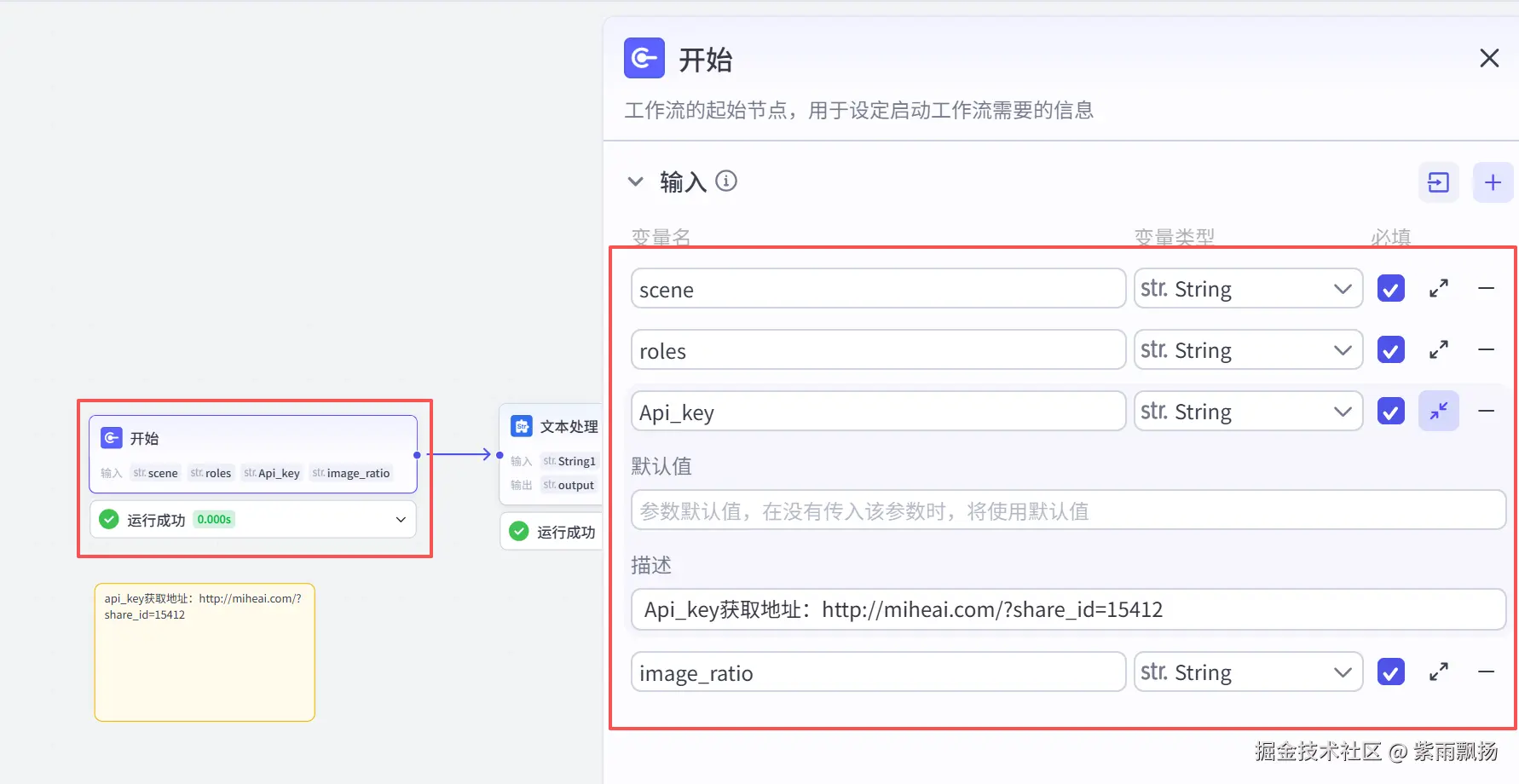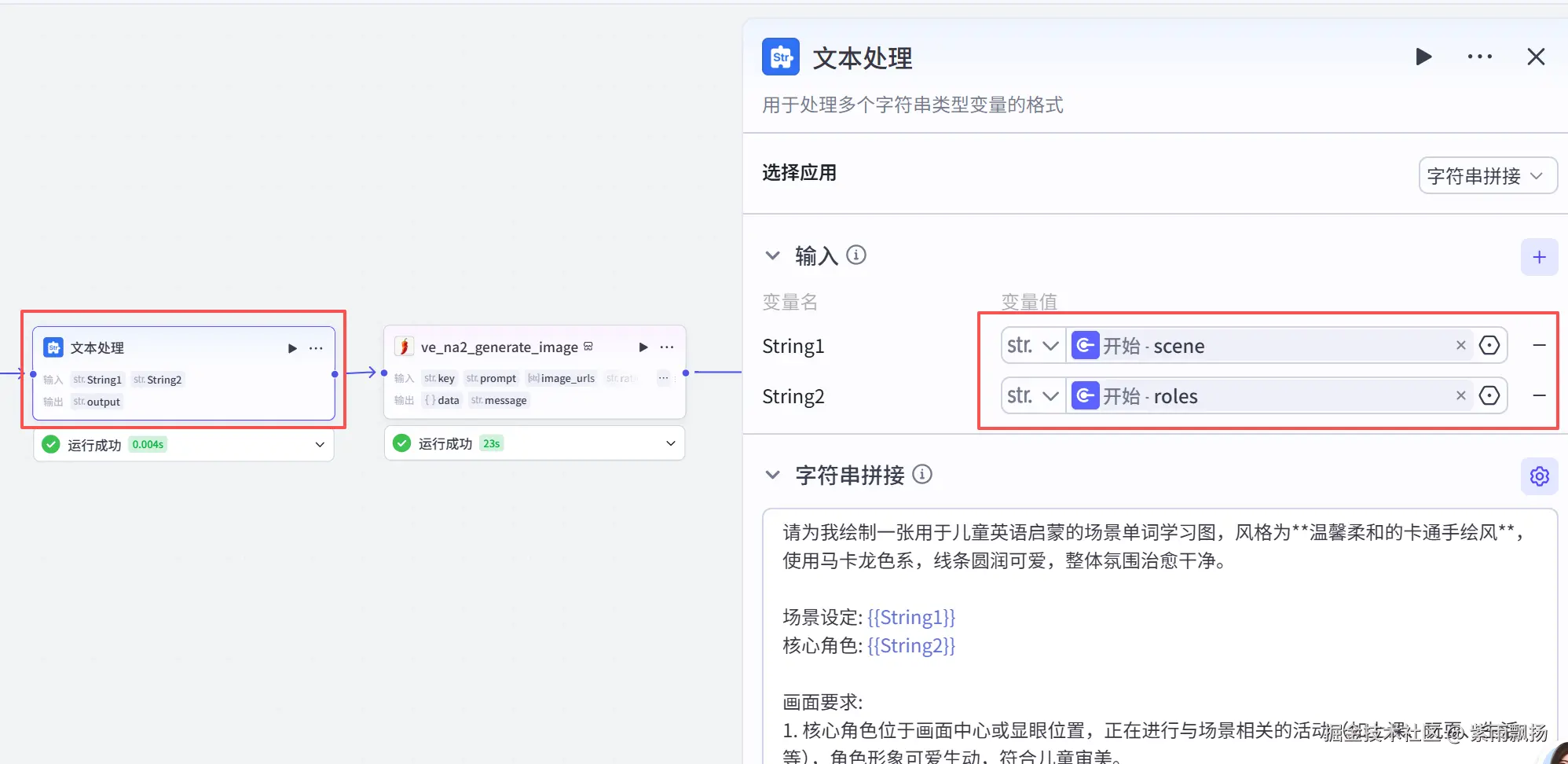 这个节点用来把使用者输入的场景和角色嵌入到绘图提示词模板中,使用到了扣子官方的【文本处理】节点,完整提示词模板放于文末,感兴趣的朋友可按照文末的方式领取。