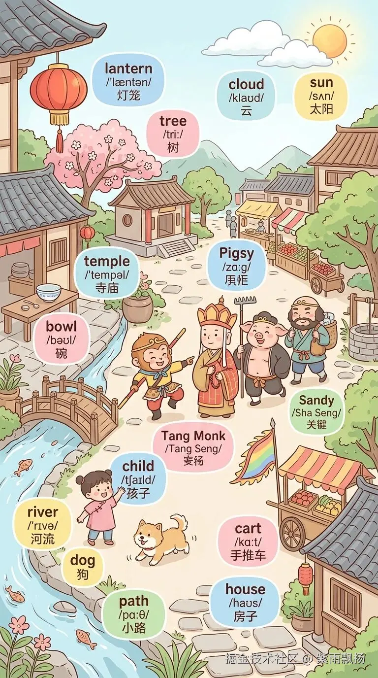 (1)输入图片比例:比如9:16,角色:如唐僧、孙悟空、猪八戒和沙僧,场景:在一个古老的村子里,点击试运行,即可得到英语卡片;