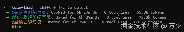 需要特别注意的是,你所创建的Agent Teams 会在你退出终端后,整个Teams便会解散,所以需要尽量在一次会话中把任务推进完