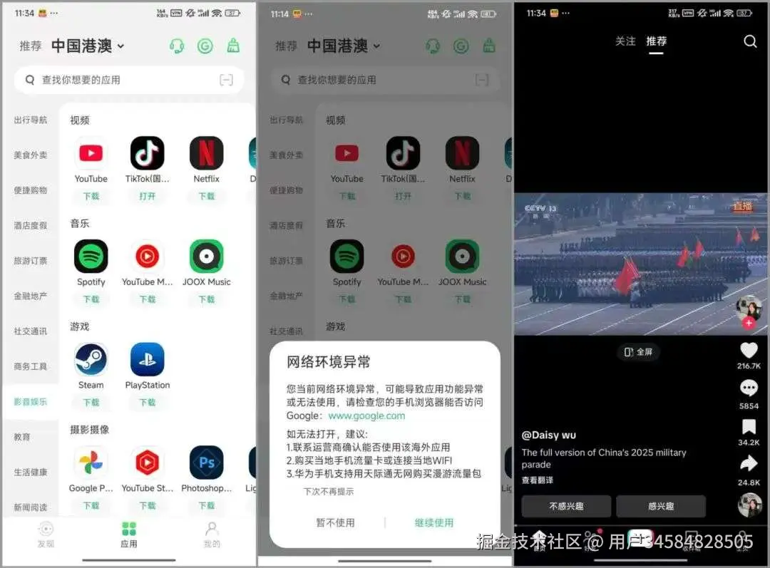 Tiktok在“出境易”这类虚拟机上,不需要拔卡,可以正常运行。