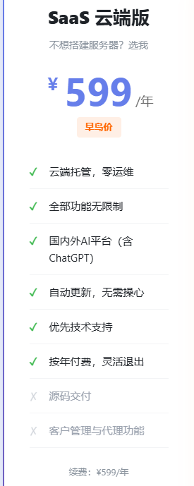 | SaaS 云端版 | 零运维入门 | 云端托管、全功能、按年付费 | 个人站长、小商家 |