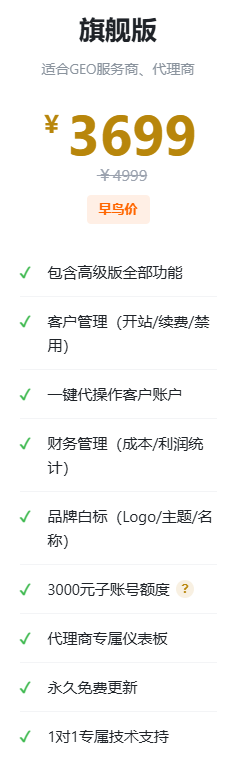 | 旗舰版 | 代理商专属 | 客户管理、品牌白标、3000 子账号额度 | GEO 服务商、代理商 |