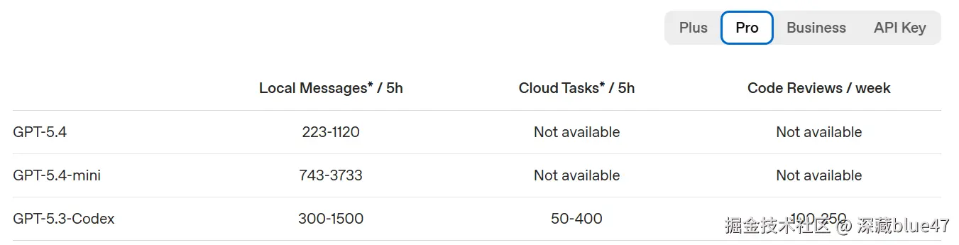 - GPT-5.4 的额度:223 ~ 1120 条