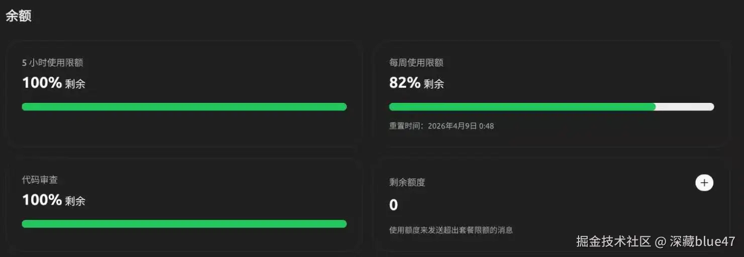 这是最直观的方法,你可以直接登录网页,在 Codex 使用情况仪表板中查看当前剩余配额。