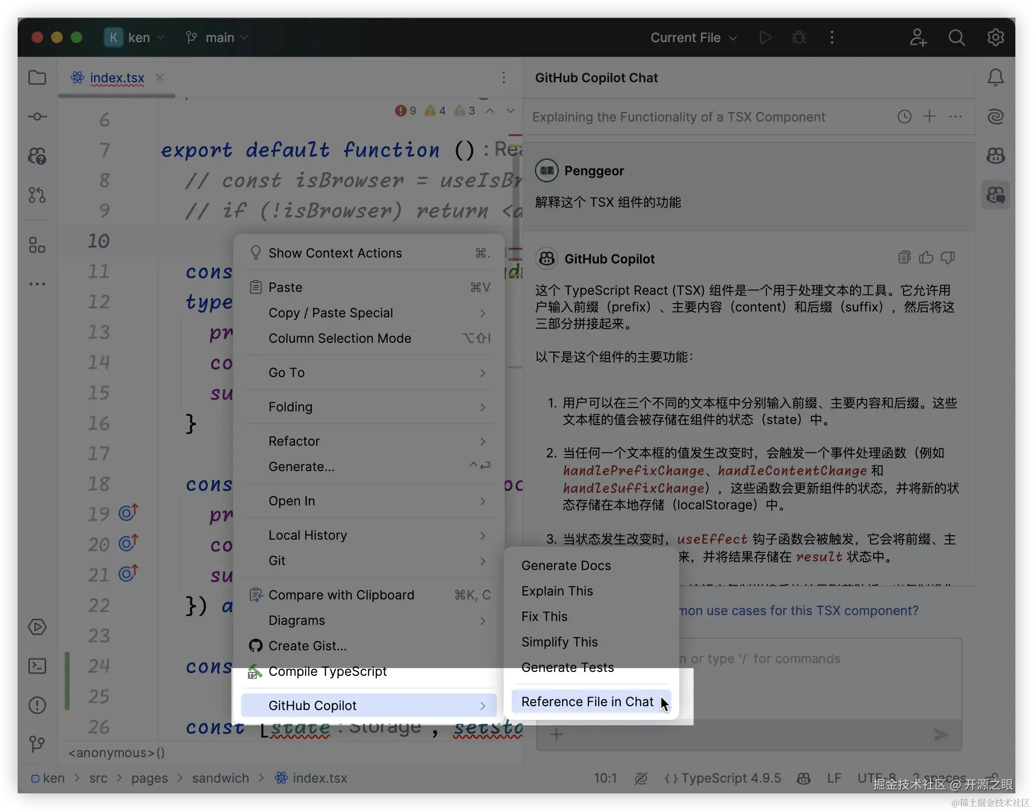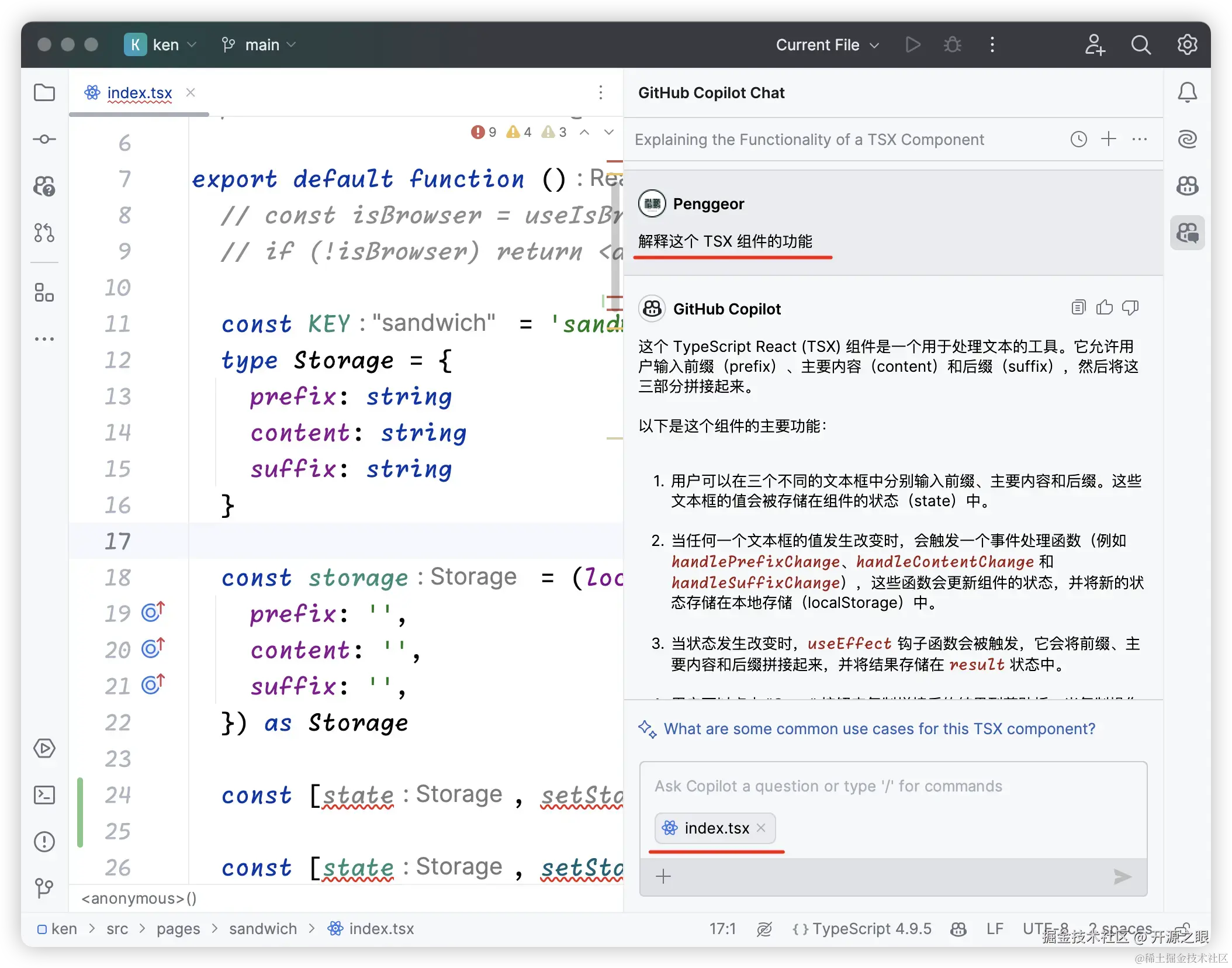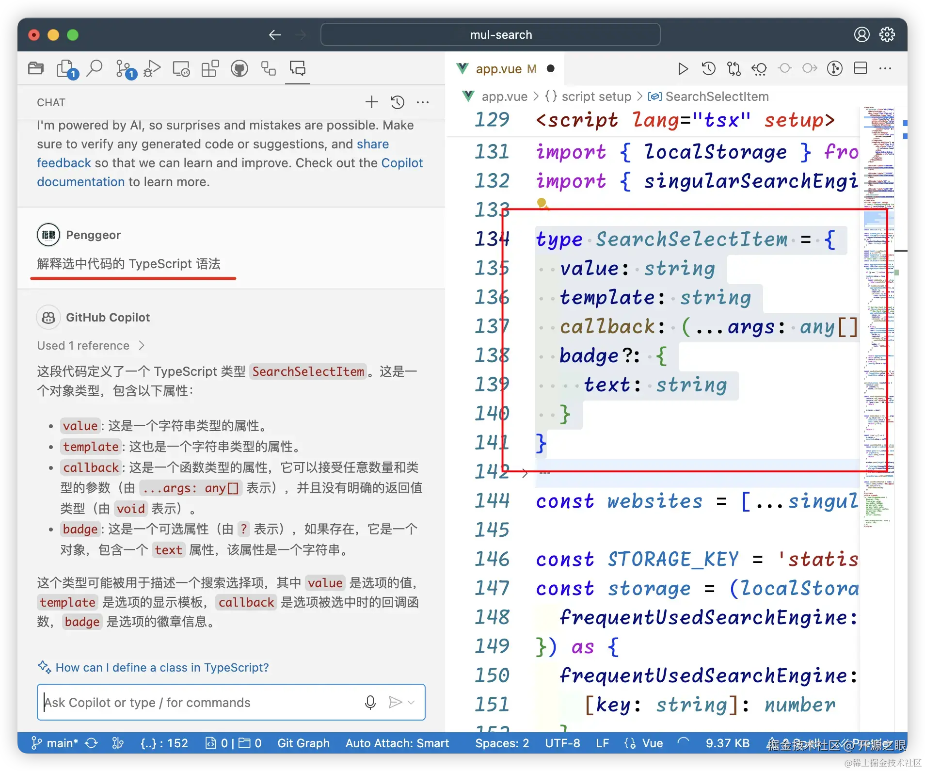 Copilot Chat 相当于为编辑器直接配置一个 GPT-4,可以方便快速地快速问答项目问题: