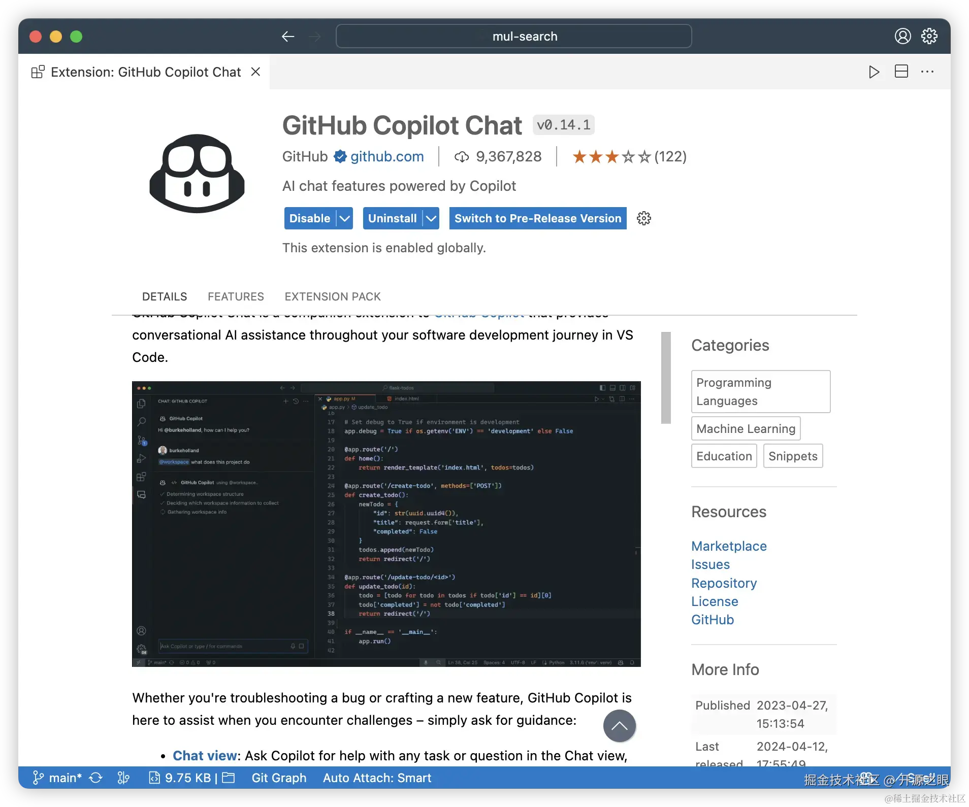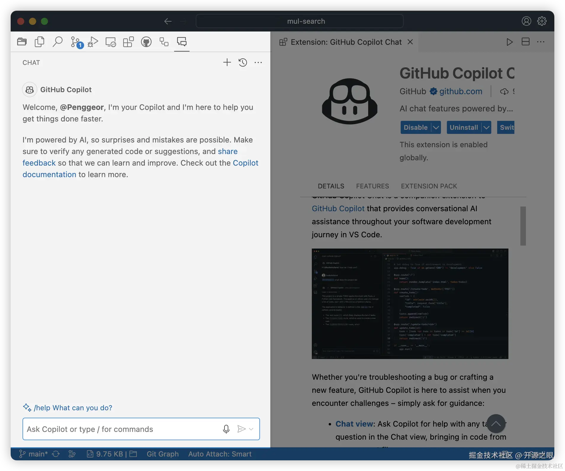 对于 VSCode 用户来说,如果要开启侧边栏 Chat 功能,需要额外安装 Copilot Chat 插件: