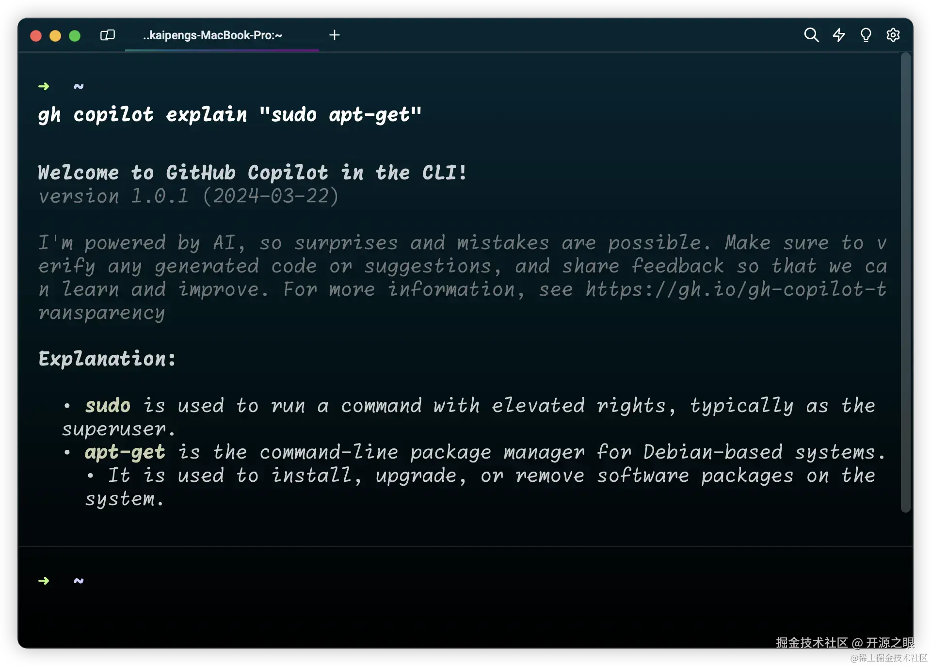 比如我们可以让 copilot 解释 sudo apt-get 这条命令的意思: