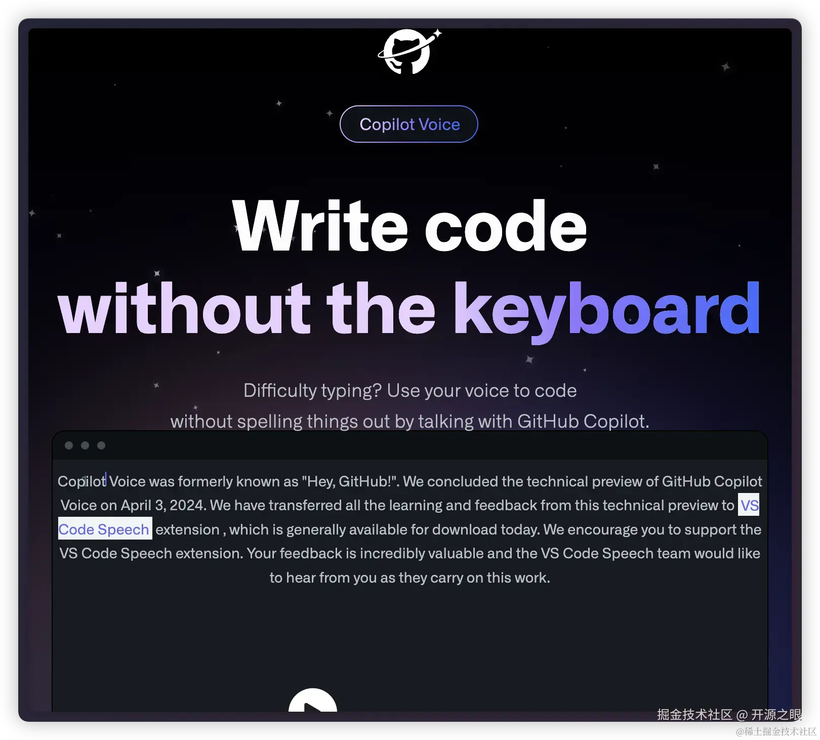 就是新的 Copilot 的新功能都会优先上架 VSCode,比如 Copilot Voice