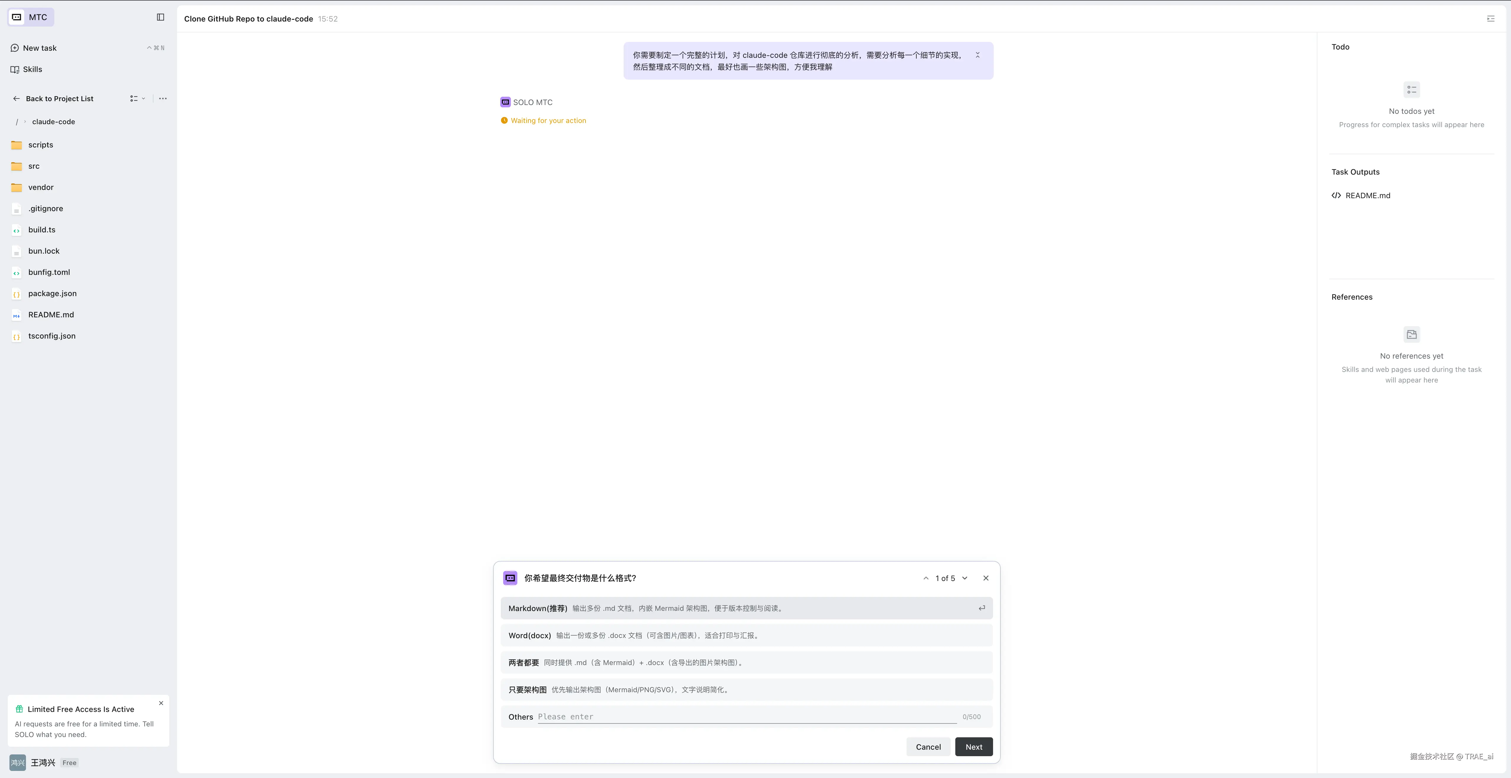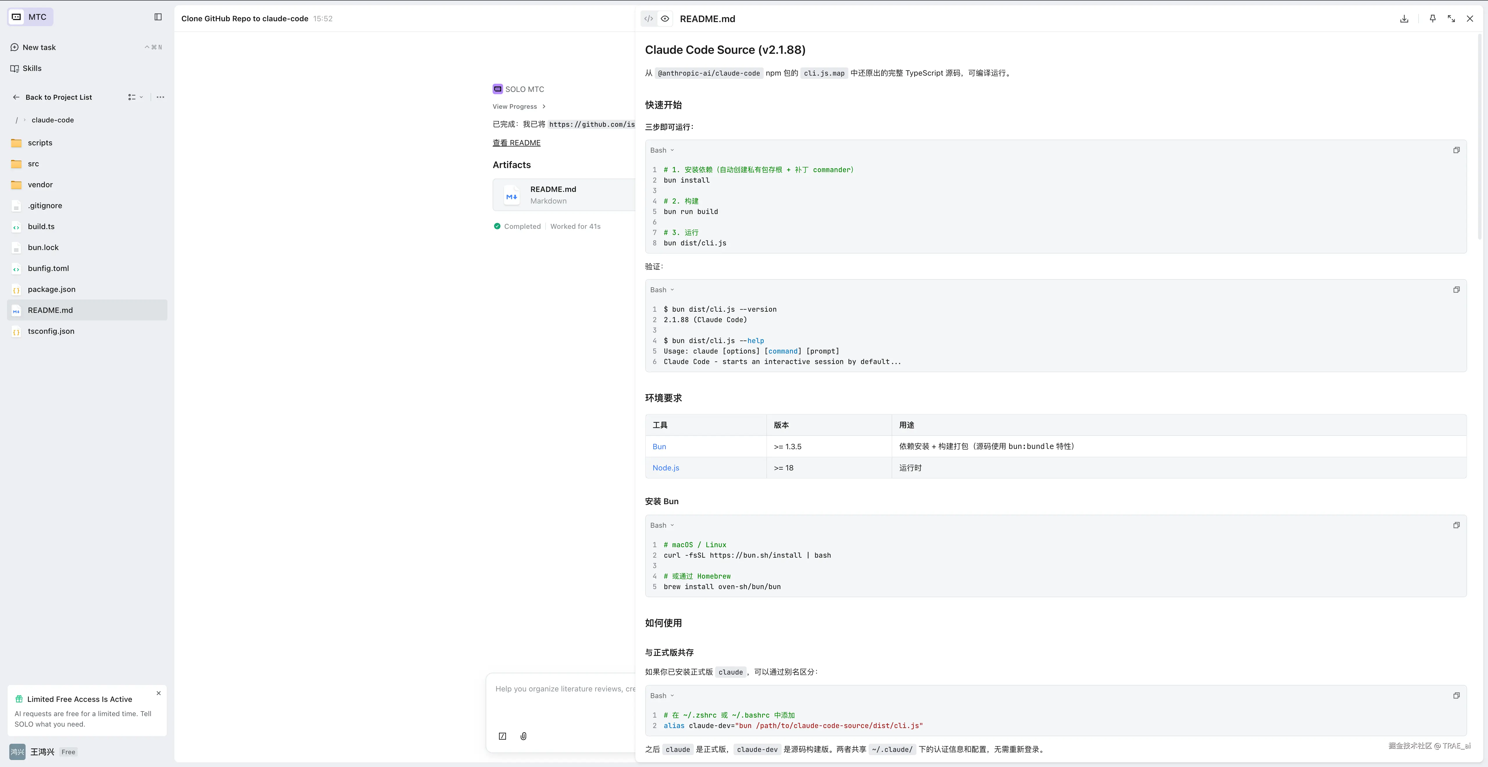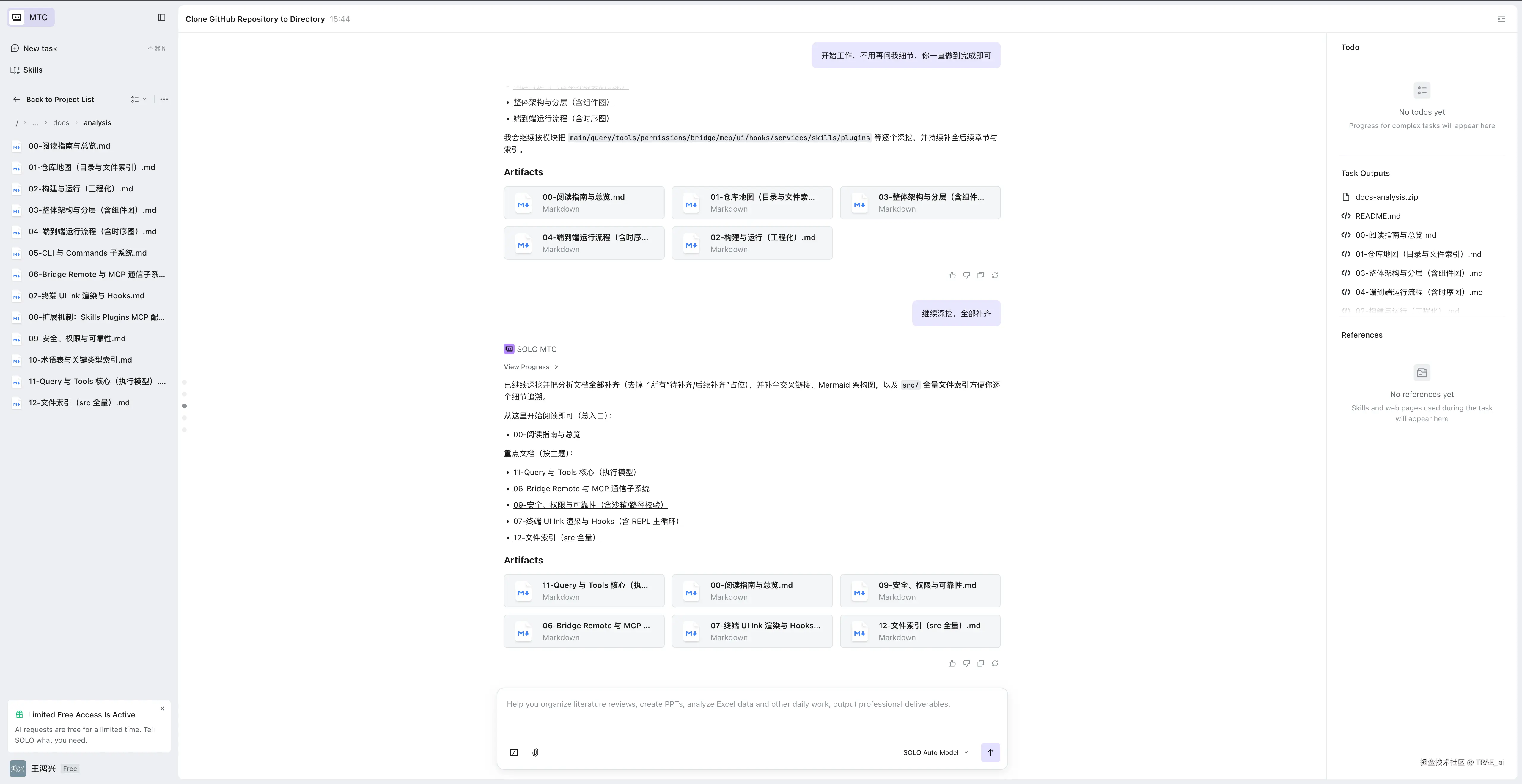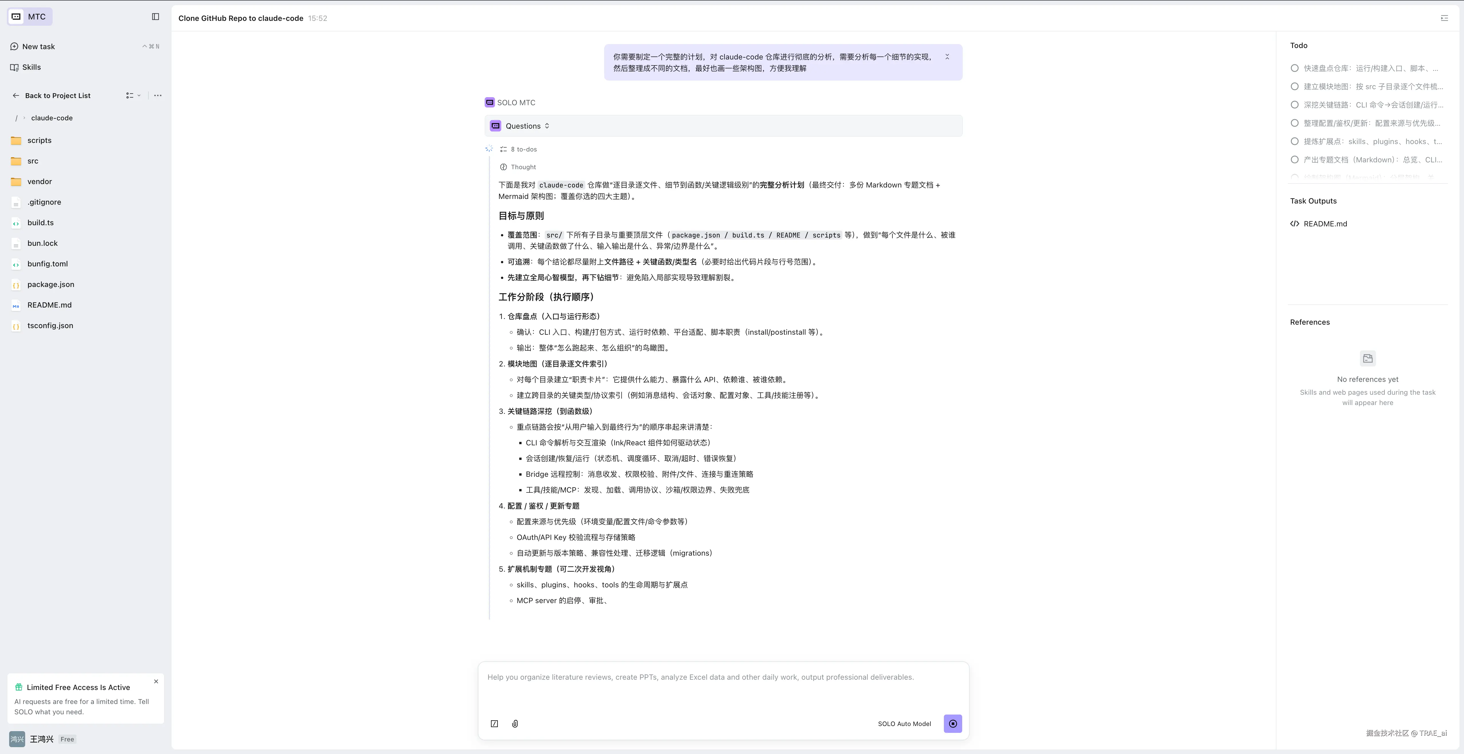 这里特别说明:Claude Code 是一款很棒的产品,有非常多值得学习的地方。本次只从「开源代码解读」这个场景为大家演示如何操作,以后遇到感兴趣的开源项目,你们也可以和 SOLO 一起更高效地分析和学习。