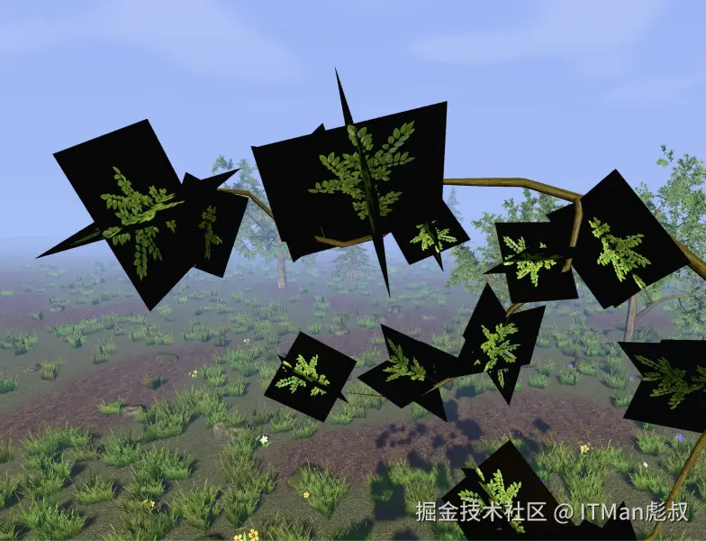 叶片的生成过程与子枝的生成过程几乎完全相同。主要区别在于,叶片是以纹理的形式渲染到四边形(即矩形平面)上的,因此我们不是生成枝条,而是生成一个四边形,并以与枝条相同的方式定位和调整其方向。