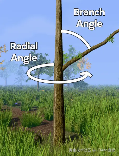 <font style="color:rgb(101, 117, 128);background-color:rgb(237, 240, 243);">origin</font>– 定义三维空间中分支的起始点<font style="color:rgb(101, 117, 128);background-color:rgb(237, 240, 243);">(x, y, z)</font>。<font style="color:rgb(101, 117, 128);background-color:rgb(237, 240, 243);">orientation</font>– 使用欧拉角指定分支的旋转<font style="color:rgb(101, 117, 128);background-color:rgb(237, 240, 243);">(pitch, yaw, roll)</font>。<font style="color:rgb(101, 117, 128);background-color:rgb(237, 240, 243);">length</font>– 树枝从根部到顶端的总长度<font style="color:rgb(101, 117, 128);background-color:rgb(237, 240, 243);">radius</font>– 设置树枝的粗细<font style="color:rgb(101, 117, 128);background-color:rgb(237, 240, 243);">level</font>– 表示递归深度,主干从第 0 层开始。<font style="color:rgb(101, 117, 128);background-color:rgb(237, 240, 243);">sectionCount</font>– 定义树干沿其长度方向被分割的次数。<font style="color:rgb(101, 117, 128);background-color:rgb(237, 240, 243);">segmentCount</font>– 通过设置树干周长周围的分段数来控制平滑度。