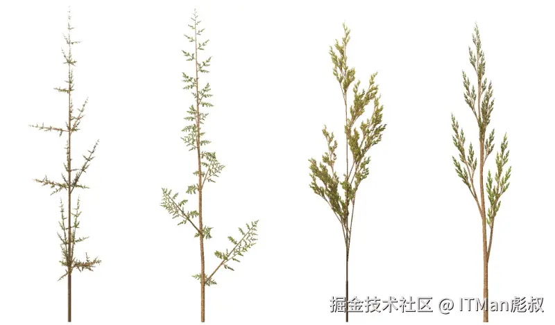 <font style="color:rgb(101, 117, 128);background-color:rgb(237, 240, 243);">type</font>我找到了几种不同的叶子纹理,因此可以生成各种不同类型的叶子。<font style="color:rgb(101, 117, 128);background-color:rgb(237, 240, 243);">size</font>– 控制叶片四边形的整体大小,使叶片变大或变小。<font style="color:rgb(101, 117, 128);background-color:rgb(237, 240, 243);">count</font>每个分支要生成的叶子数量<font style="color:rgb(101, 117, 128);background-color:rgb(237, 240, 243);">angle</font>– 叶片相对于枝条的角度(类似于枝条<font style="color:rgb(101, 117, 128);background-color:rgb(237, 240, 243);">angle</font>参数)