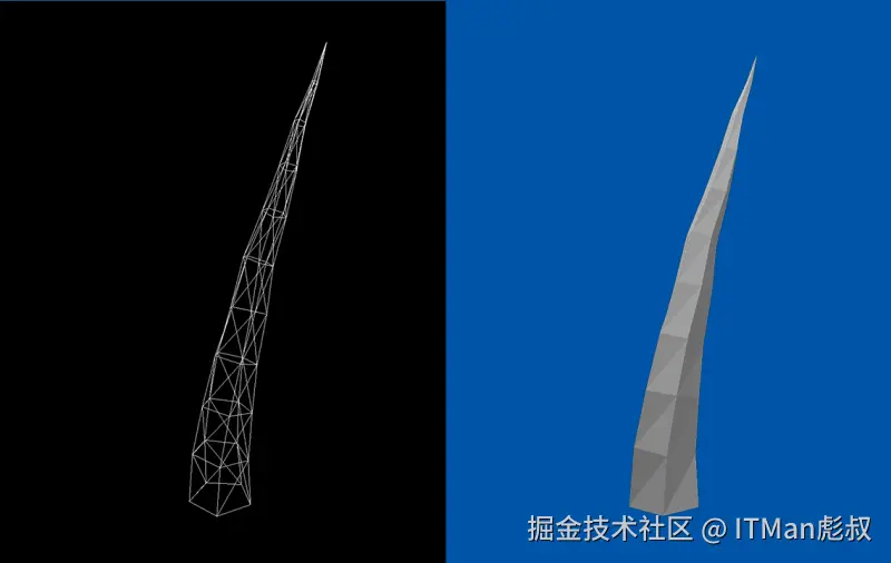 <font style="color:rgb(101, 117, 128);background-color:rgb(237, 240, 243);">THREE.Vector3</font>包含其 x、y 和 z 坐标的数组表示。这些点构成了几何体的“基本组成单元”。 - 索引——一个整数列表,用于定义顶点如何连接形成面(通常是三角形)。索引引用已有的顶点,而不是为每个面存储重复的顶点,从而显著降低内存使用量。例如,三个索引 [0, 1, 2] 使用顶点列表中的第一个、第二个和第三个顶点构成一个三角形。