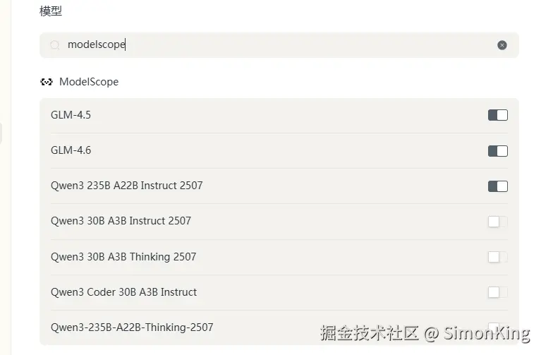 我们以OpenCode为例,搜索MocelScope模型厂商,填入刚才申请的API Key,就可以看到默认支持的模型如图: