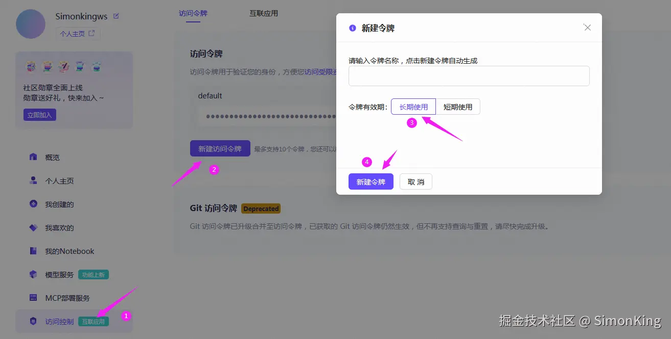 注册完成完成之后我们需要常见令牌,可以选择长期有效。这就是我们要用的API Key