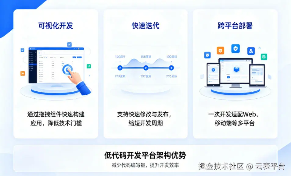 低代码开发平台:可视化拖拽为主,少量代码补充,门槛低,业务人员可上手,开发周期短(几天至几周),迭代灵活,人力成本低,支持全生命周期管理。