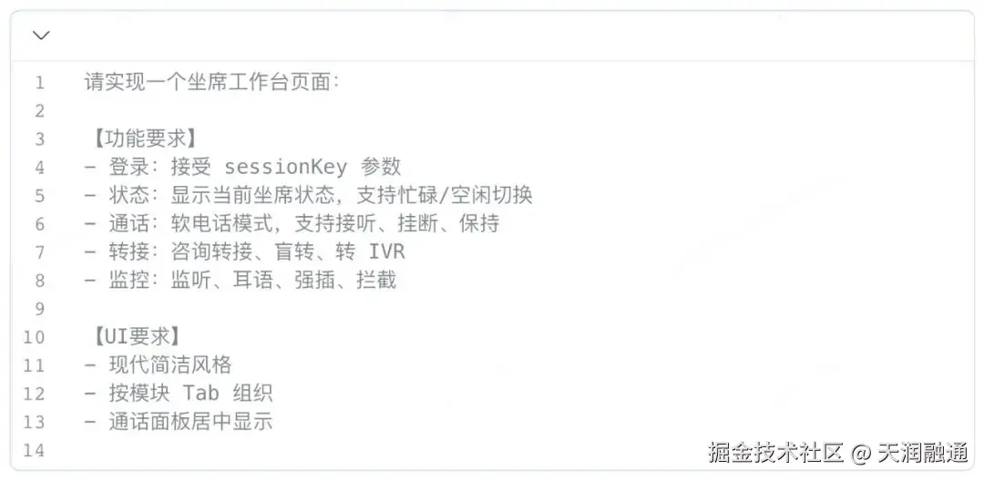 当开发者把业务需求描述清楚,比如需要一个什么样的座席工作台、包含哪些功能模块、界面如何组织、交互如何呈现,OpenClaw就能够直接生成相对完整的HTML和JS代码。
