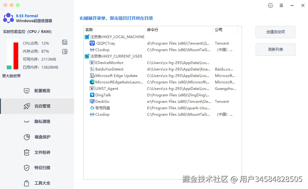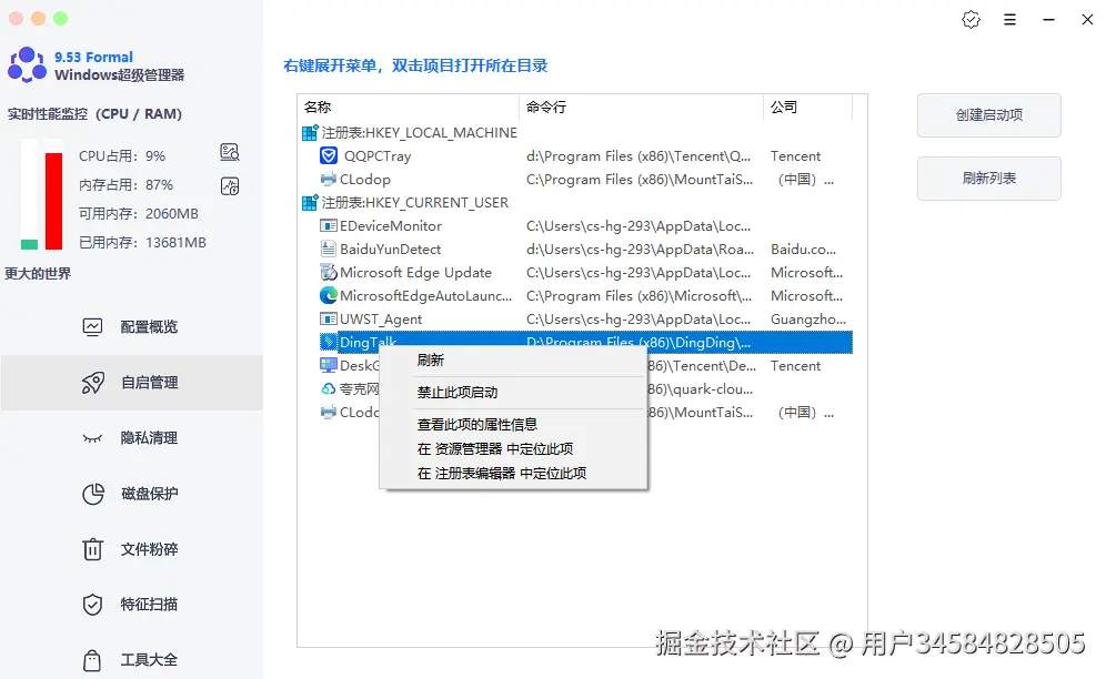 操作也比较简单,直接点击右键选择要禁止启动的软件就行,同样的,通过右键也可以添加相关的软件启动。