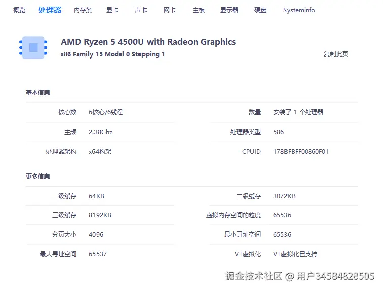 比如说我们查看处理器信息时,可以看到,很多的信息能更具体的展示出来,通过右上角的复制此页也可以把内容复制下来。