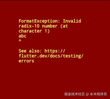 int result = int.parse('abc'); // 除以 0,会触发异常