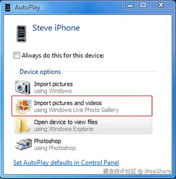 - 在电脑端,根据需要选择 “导入照片和视频” 或 “打开设备以查看文件”。