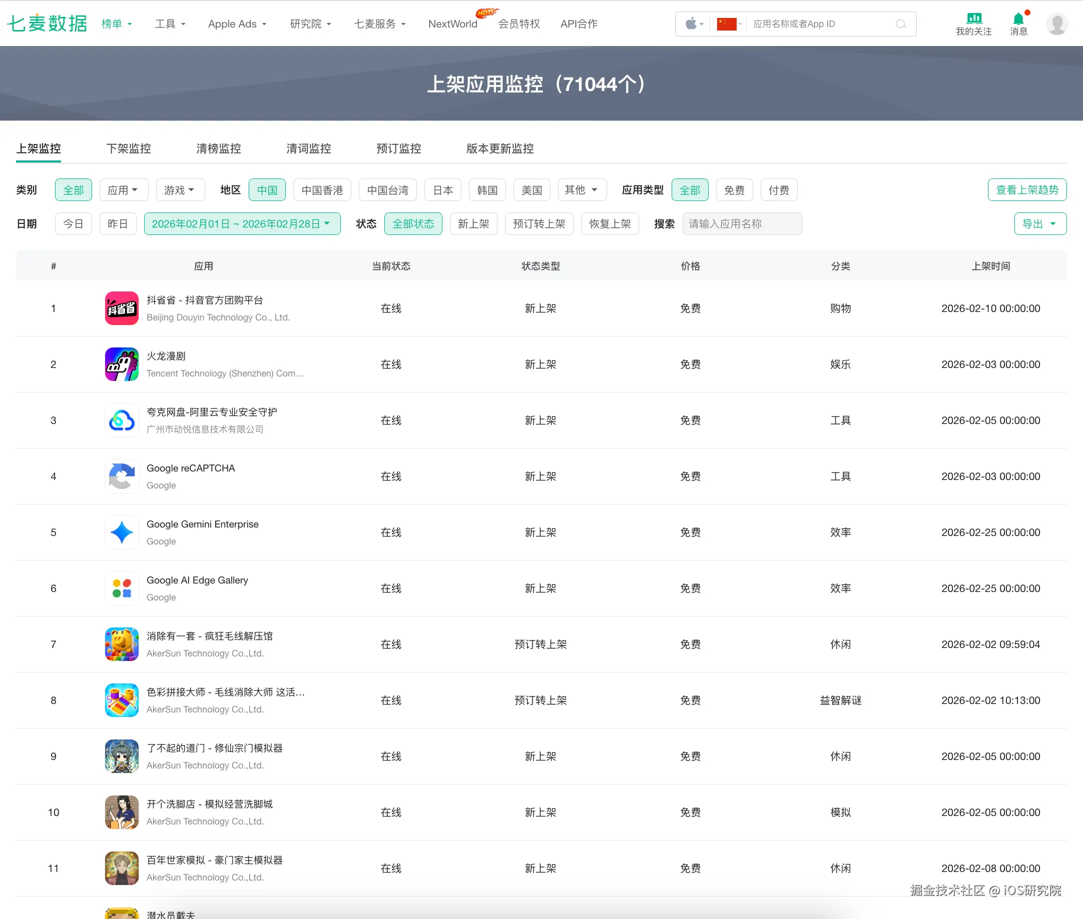 - 2026 年 2 月:上架总量 71044 个,Google Gemini 全系列 AI 工具、抖音 AI 相关产品密集上线,AI 工具从 “小众试水” 走向 “主流爆发”,审核团队需同时处理数十款 AI 应用的合规性审查;