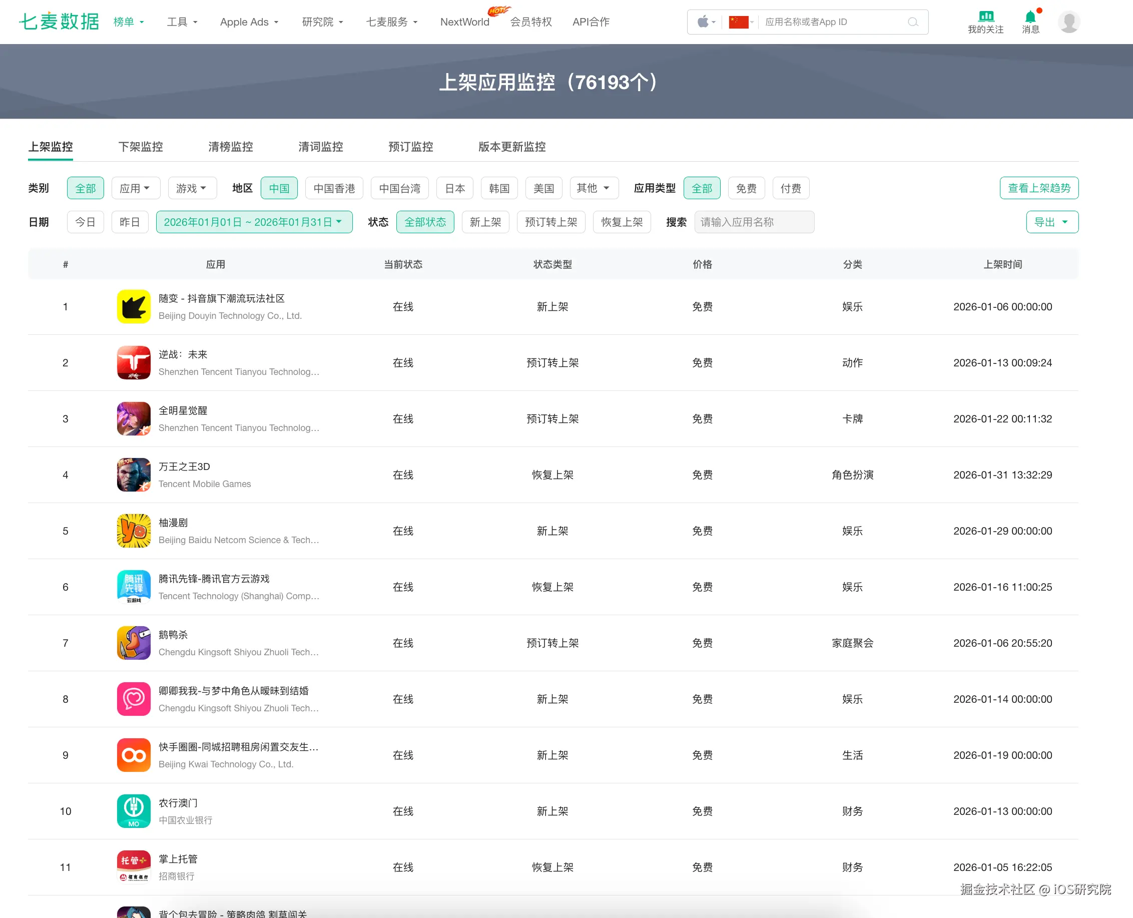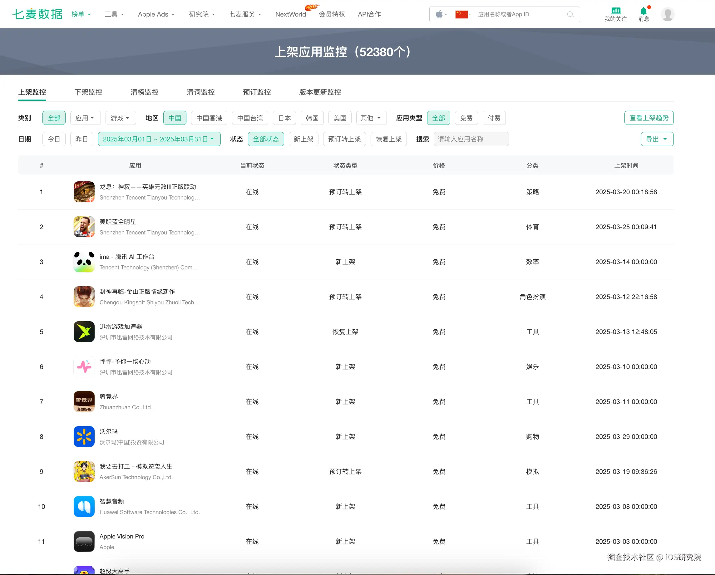 从四组七麦数据的上架监控报表中,能清晰看到 AI 工具对审核体系的冲击轨迹: