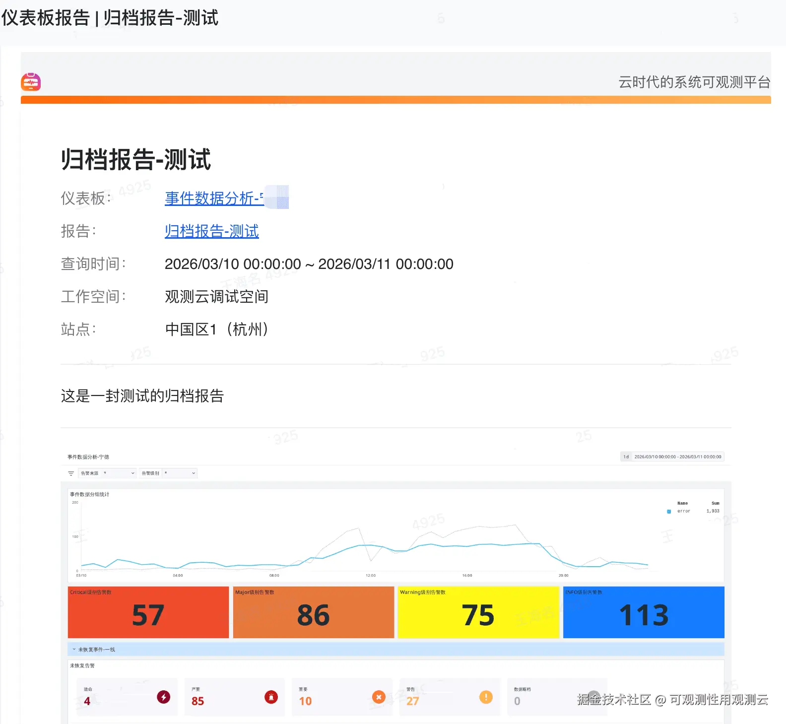 当报告任务完成后,观测云会在后台完成图片的渲染和数据的预拉取。对于运维团队来说,巡检动作从“打开电脑 -> 登录系统 -> 刷新加载”简化为了“查看邮件 -> 点击异常 -> 深入下钻”。