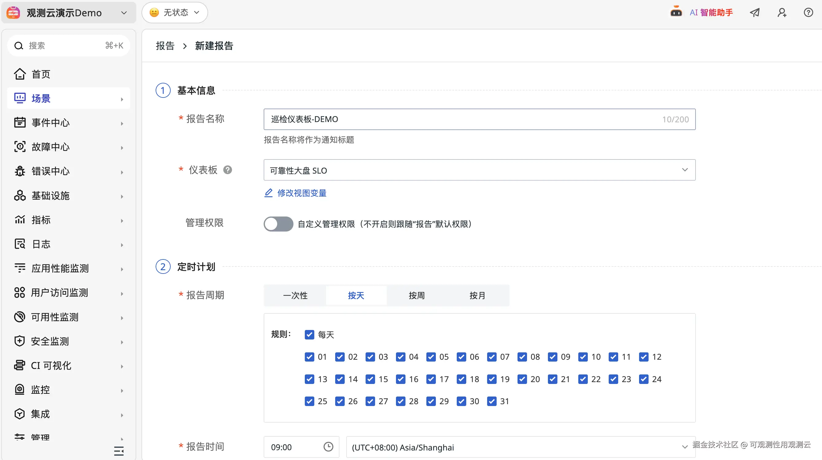 - 进入功能模块: 在观测云左侧导航栏,选择「场景」-「报告」,点击「新建报告」。
