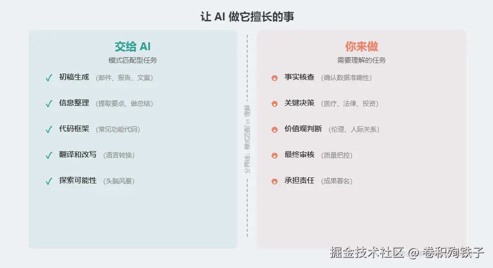 - 事实核查:确认一个数据是否准确、一个引用是否存在——AI 不区分真假(第 7 篇、第 9 篇)