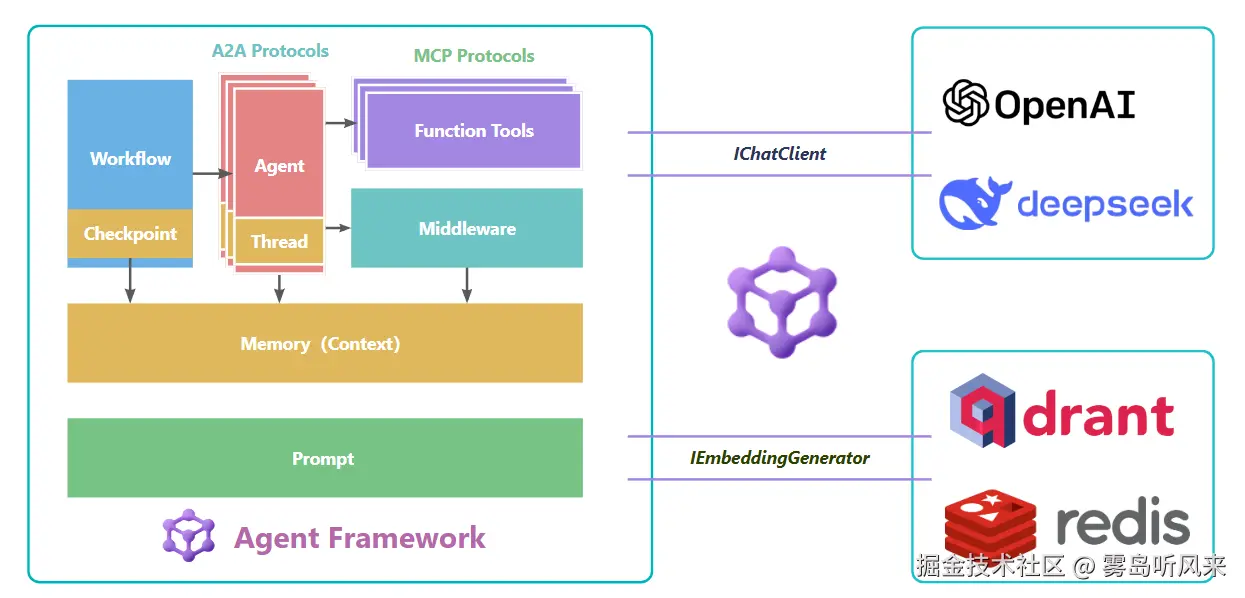 这意味着什么? .NET开发者可以用熟悉的依赖注入、中间件模式开发AI应用,不再需要学习Python那套完全不同的开发范式。