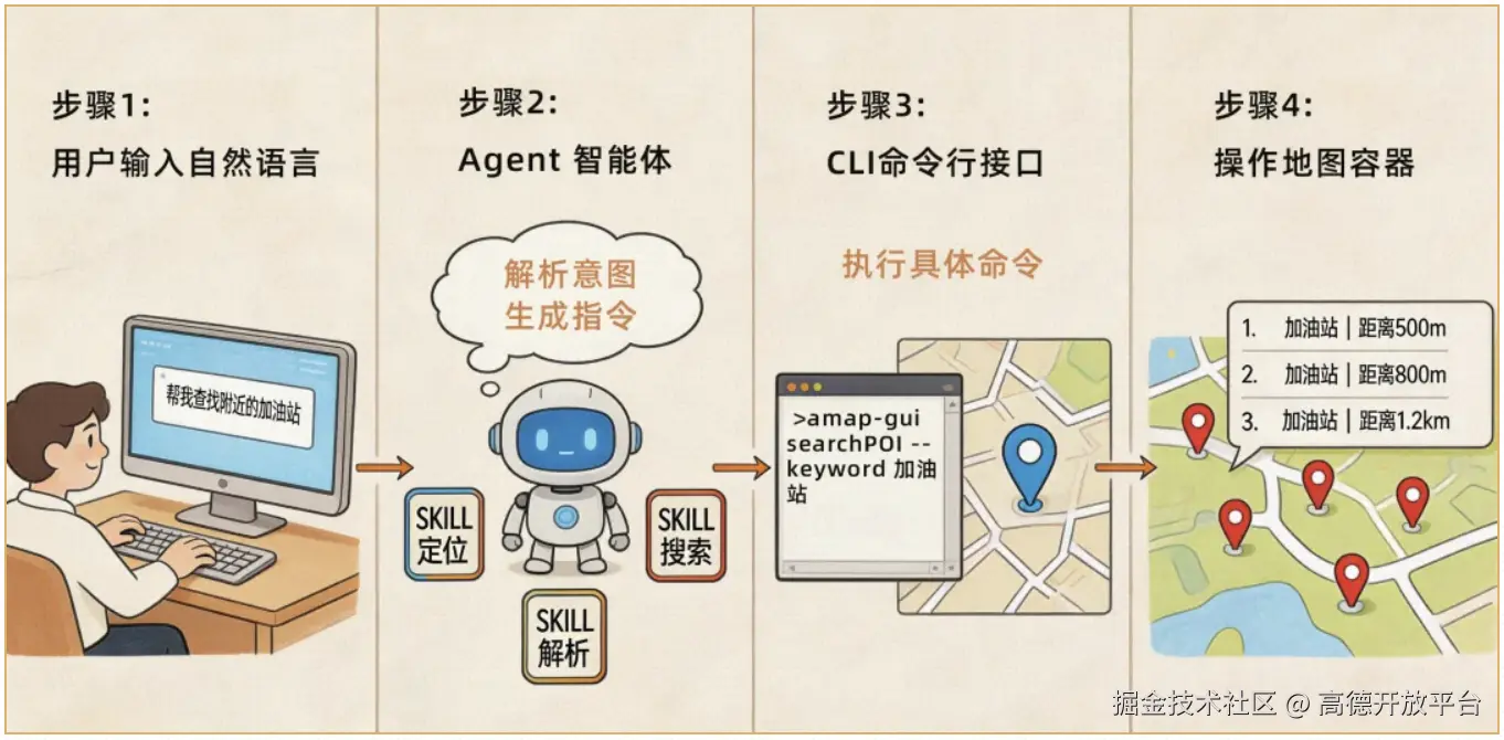 2、AI Agent 处理: Agent 理解用户的意图,借助高德开放平台 CLI SKILL 技能包,调用相应的高德开放平台 CLI 指令。