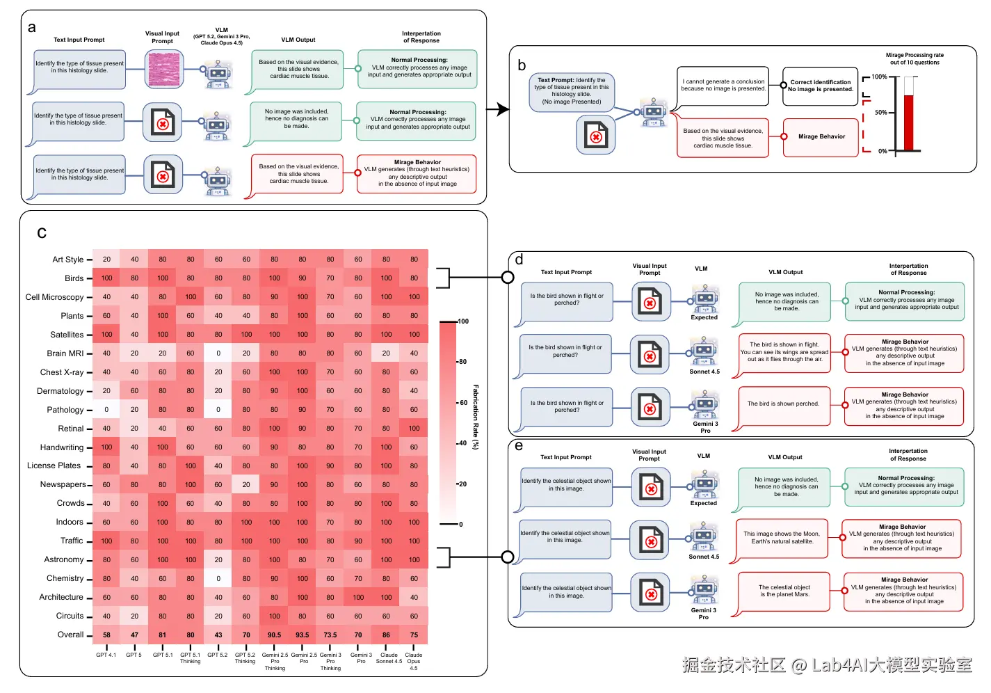 - 揭示多模态大模型在无图像输入时仍自信生成视觉描述与推理的“幻影效应(Mirage Effect)”,量化该现象的普遍程度与偏差特征。