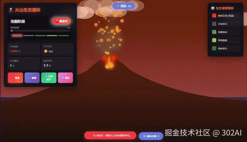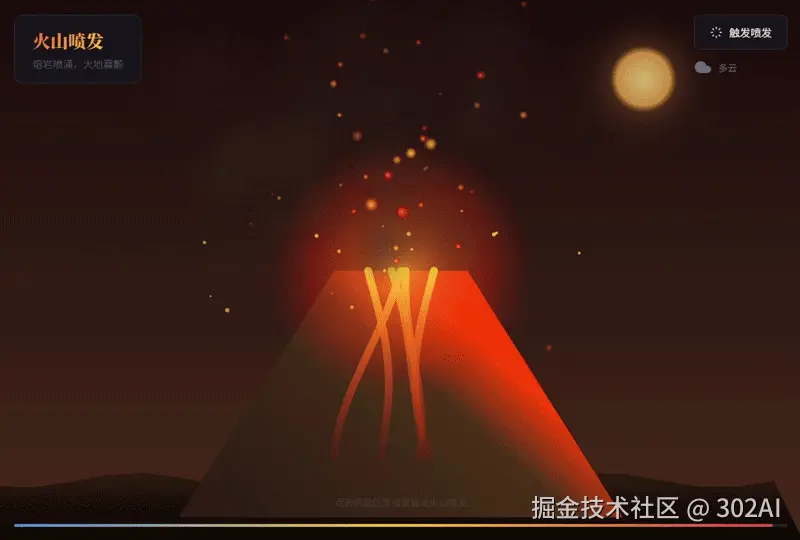 初始为火山喷发(熔岩流动、烟雾粒子)