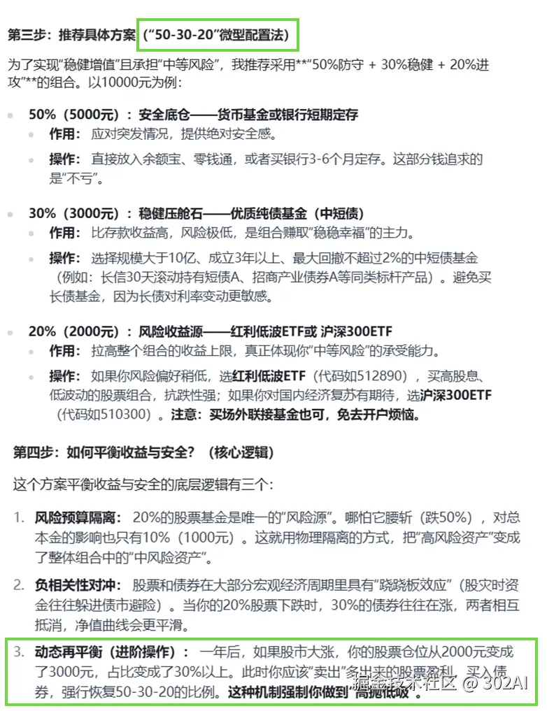 GLM-5-Turbo 输出的方案逻辑清晰,针对小额资金制定特化设计,精准回应题目约束的“5000-10000元”条件;风险分析到位,“50-30-20”微型配置法符合稳健定位,且额外提及了动态再平衡机制。