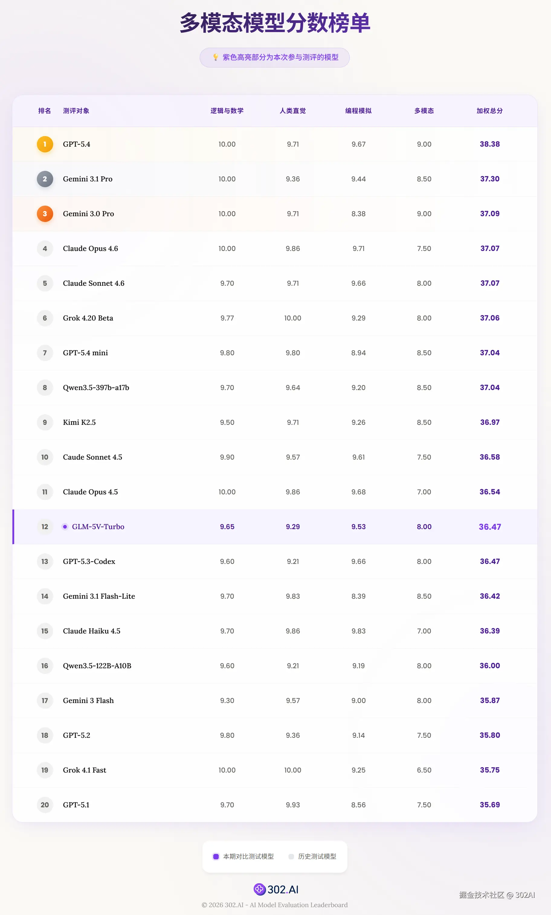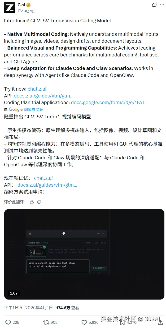 整体来看,GLM-5V-Turbo 的核心升级点在于将“看、写、做”三件事整合到同一模型之中。这种能力组合的变化,也让“看图写代码”开始从演示走向更实际的使用场景。本期文章,302.AI将针对 GLM-5V-Turbo 的核心能力展开对比实测,探索其真实表现。